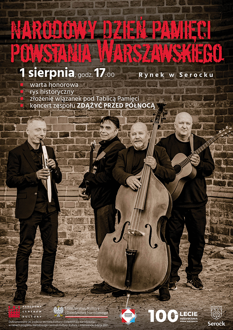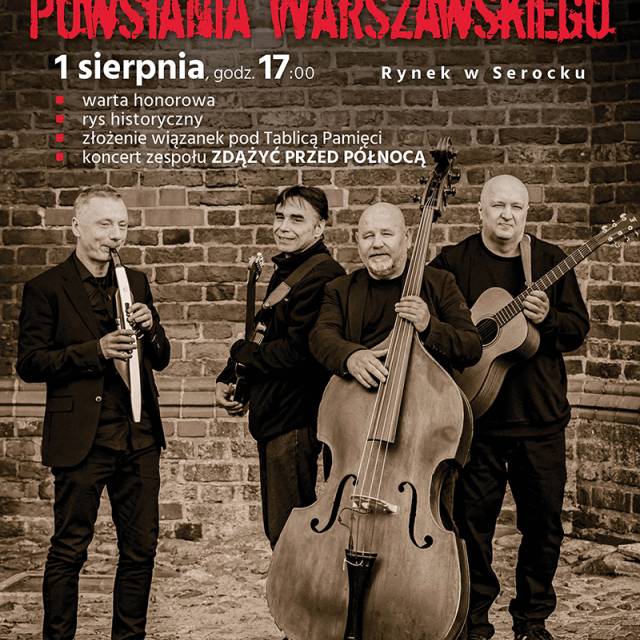 Zaproszamy na obchody upamiętnienia rocznicy Powstania Warszawskiego na Rynek w Serocku. Po uroczystej warcie honorowej odbędzie się koncert zespołu Zdążyć przed północą.