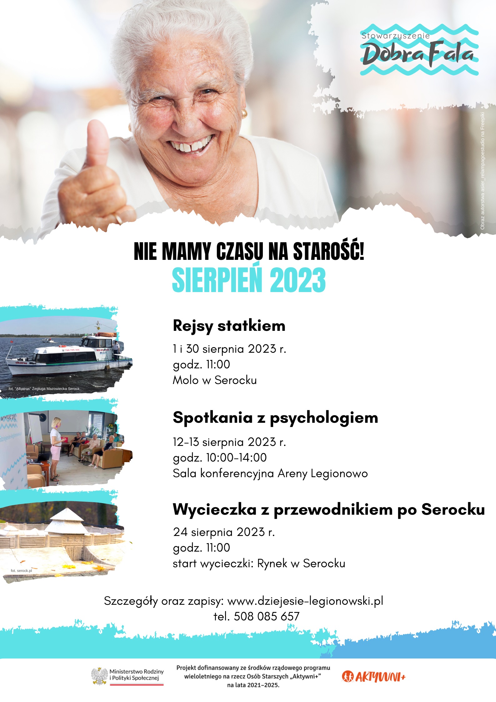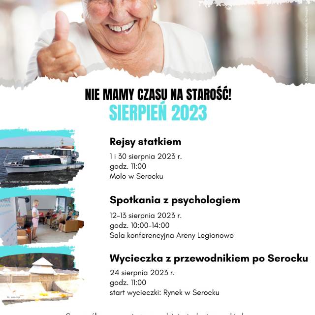 Legionowskie Stowarzyszenie Dobra Fala, pełną parą rusza z realizacją projektu „Nie mamy czasu na starość!”. Dla mieszkańców powiatu legionowskiego, którzy ukończyli 60 lat w sierpniu zaplanowano kilka atrakcji.
