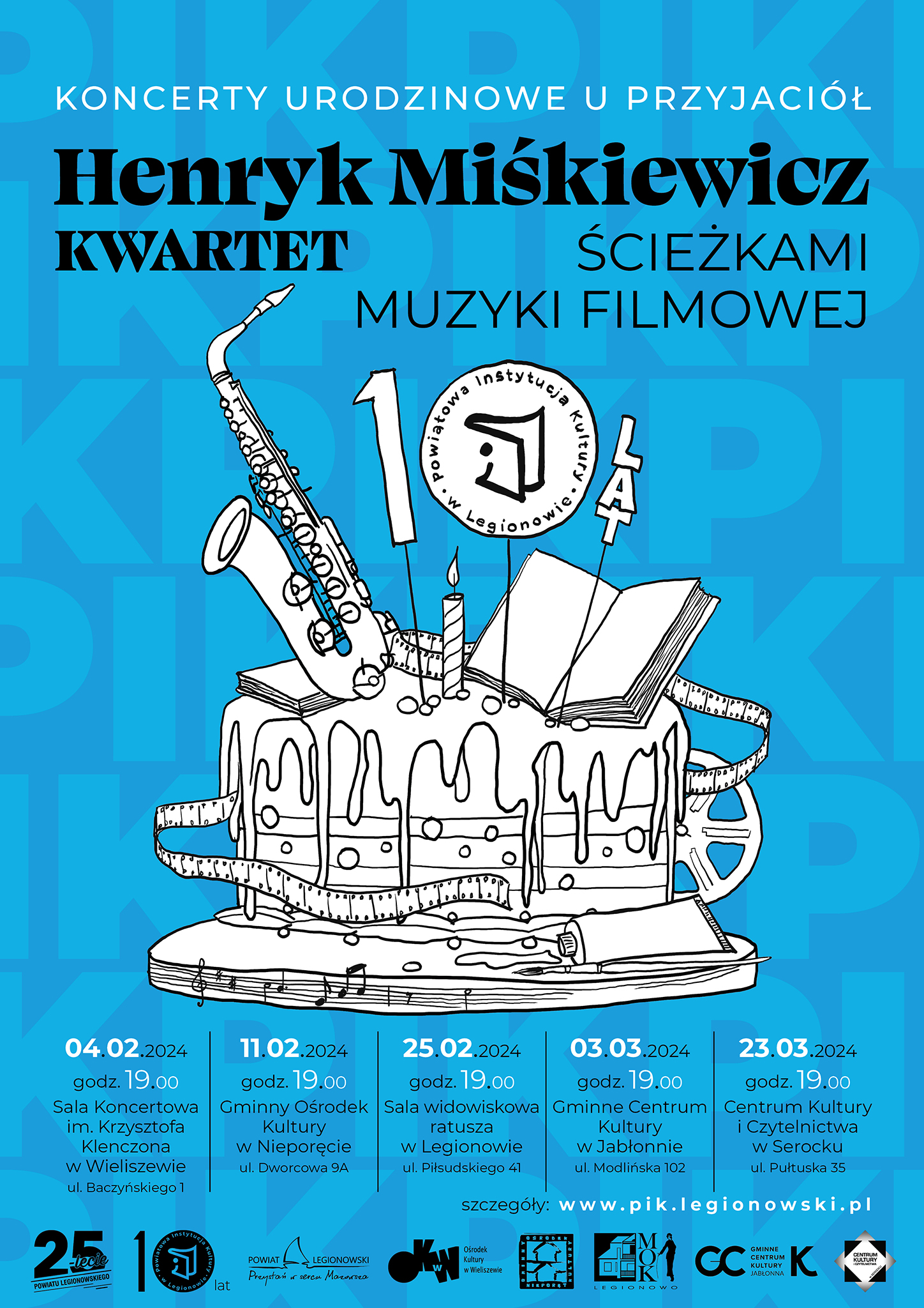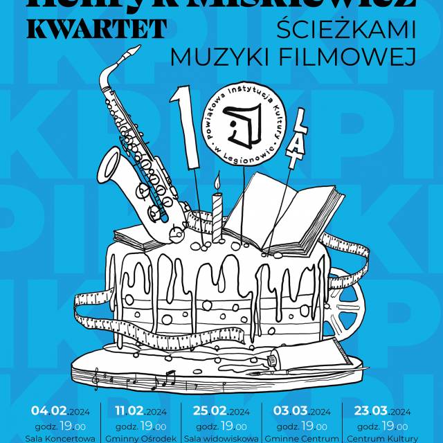 Zastanawialiśmy się, jaki sposób świętowania 10-lecia pasowałby do dotychczasowej działalności PIK, a jednocześnie pozwolił nam na cieszenie się tym jubileuszem wspólnie z Wami – odbiorcami i uczestnikami organizowanych przez nas wydarzeń, czytelniczkami i czytelnikami, bliskimi współpracownikami, Przyjaciółmi. Najchętniej przy dobrej muzyce, jak na urodziny przystało! Wynikiem naszych przemyśleń jest cykl pięciu koncertów pt. „Ścieżkami muzyki filmowej" w wykonaniu Henryk Miśkiewicz Kwartet, z którymi zawitamy do wszystkich gmin powiatu legionowskiego.