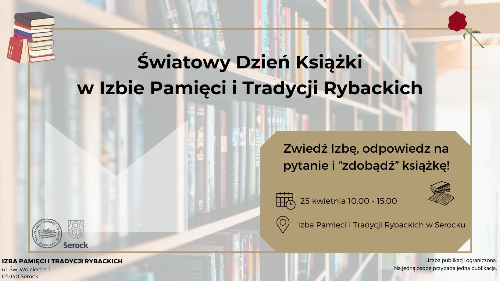 Z okazji Światowego Dnia Książki zapraszamy już w najbliższy czwartek (25.04) do Izby Pamięci i Tradycji Rybackich, gdzie będzie możliwość „zdobycia” kilku naszych książkowych publikacji.