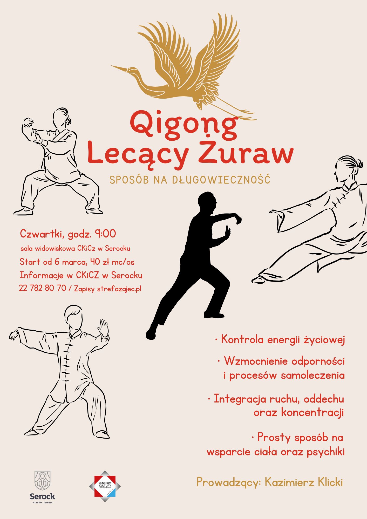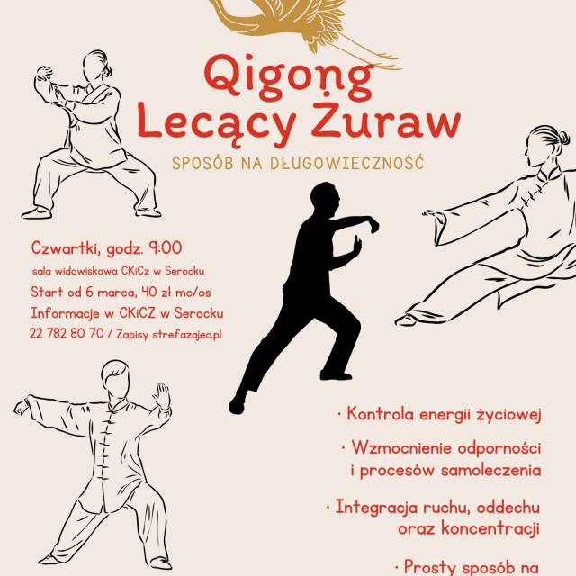 Zapraszamy na zajęcia Qigong - Lecący Zuraw. Prosty sposób na wsparcie ciała oraz psychiki. Ćwiczenia Qigong mają charakter uniwersalny (wspomagają właściwą postawę ciała; kontrolowane oddychanie; świadome kierowanie przepływem energii w ciele; delikatne ruchy).