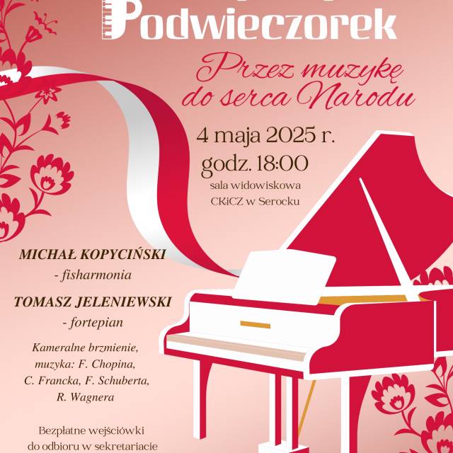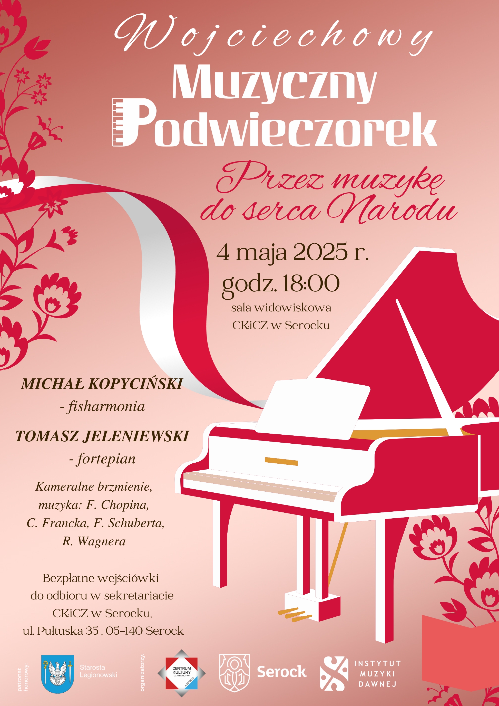 Zapraszamy serdecznie na wyjątkowy koncert z cyklu „Wojciechowy Muzyczny Podwieczorek” pod hasłem „Przez muzykę do serca Narodu”, który odbędzie się 4 maja 2025 r. o godz. 18:00 w sali widowiskowej Centrum Kultury i Czytelnictwa w Serocku.