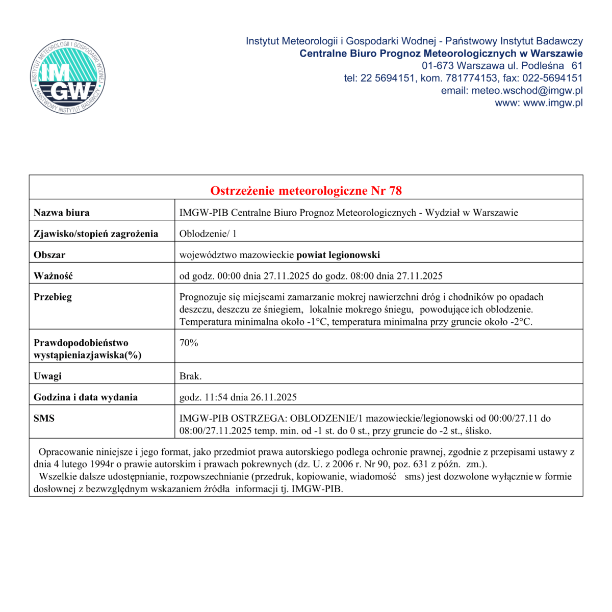 Ostrzeżenie meterologiczne - oblodzenie