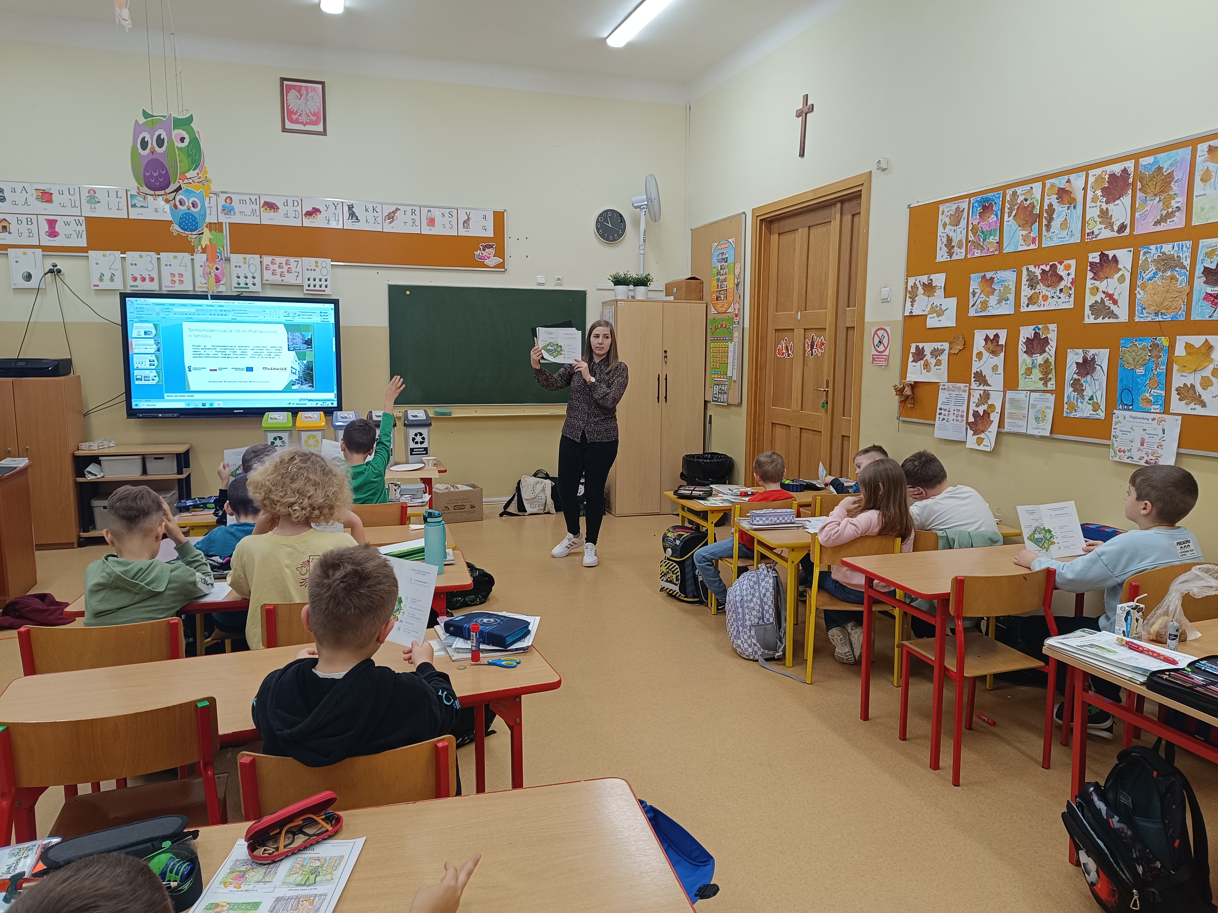 Na podstawie przykładów oraz dodatkowych materiałów dydaktycznych, w tym m.in. ulotki opracowanej w ramach realizowanego przez gminę projektu pn. „Termomodernizacja budynku użyteczności publicznej Szkoły Podstawowej i Przedszkola w Serocku”, uczniowie mogli zobaczyć, jakie urządzenia służą do pozyskiwania energii odnawialnej.