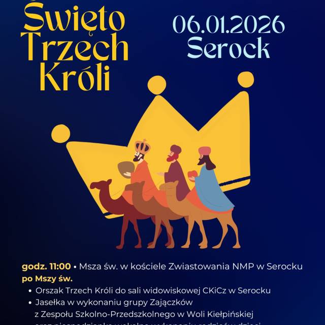 Burmistrz Miasta i Gminy Serock Artur Borkowski, Proboszcz Parafii pw. św. Anny w Serocku dr Dariusz Rojek, oraz Proboszcz Parafii pw. św. Antoniego w Woli Kiełpińskiej ks. Andrzej Marchlewski zapraszają na Święto Trzech Króli.