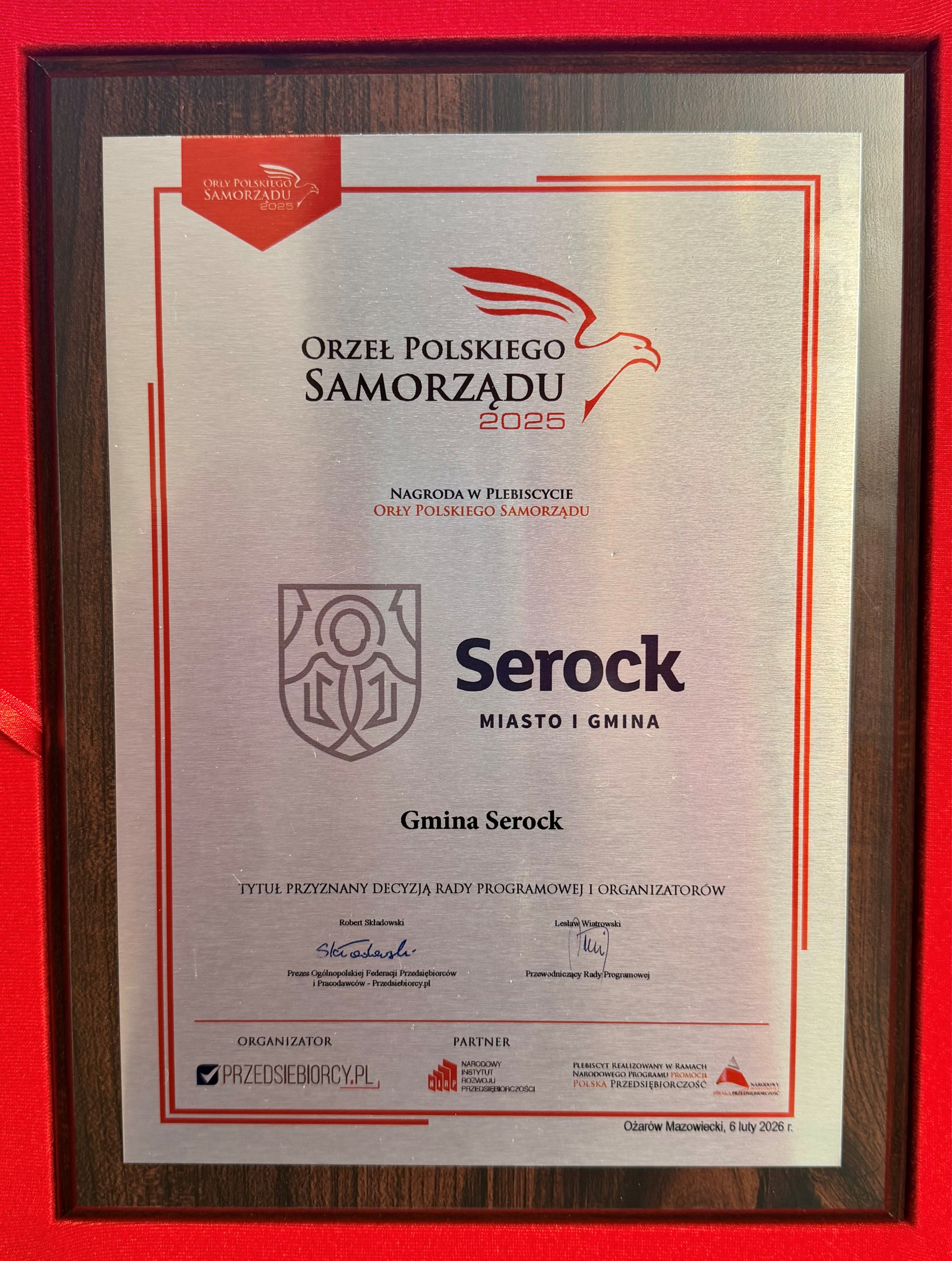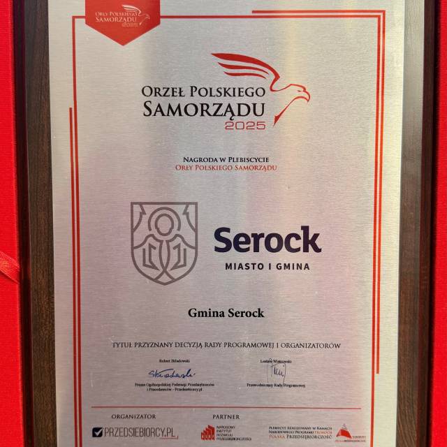 Z dumą informujemy, że Gmina Serock została uhonorowana prestiżową nagrodą „Orły Polskiego Samorządu 2025”, przyznaną decyzją Rady Programowej i organizatorów. Uroczysta gala odbyła się 6 lutego 2026 r. w Ożarowie Mazowieckim.
