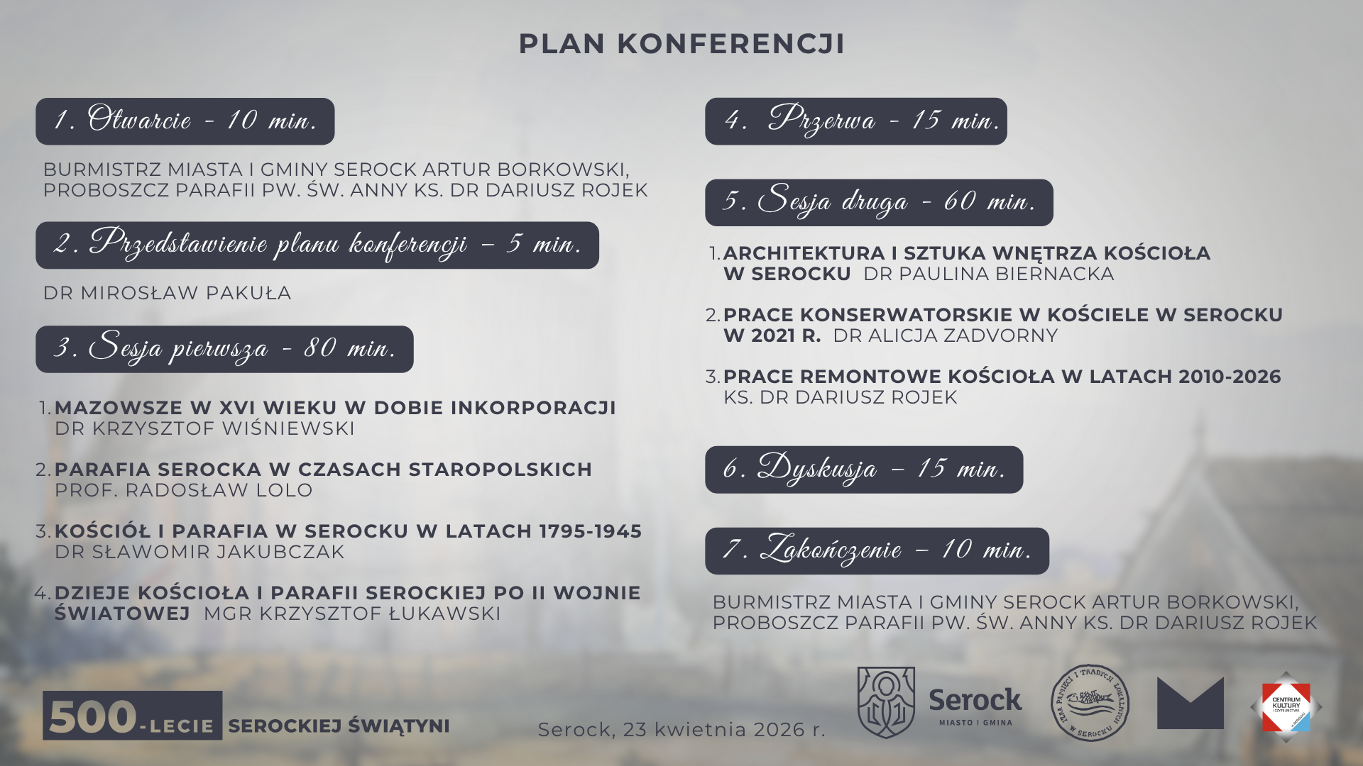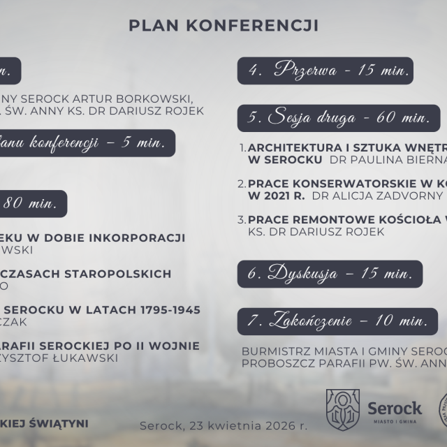 Podczas konferencji zaproszeni prelegenci przedstawią historię Mazowsza w XVI wieku, dzieje parafii serockiej na przestrzeni wieków oraz zagadnienia związane z architekturą, konserwacją i remontami kościoła. W programie przewidziano dwie sesje tematyczne oraz dyskusję.