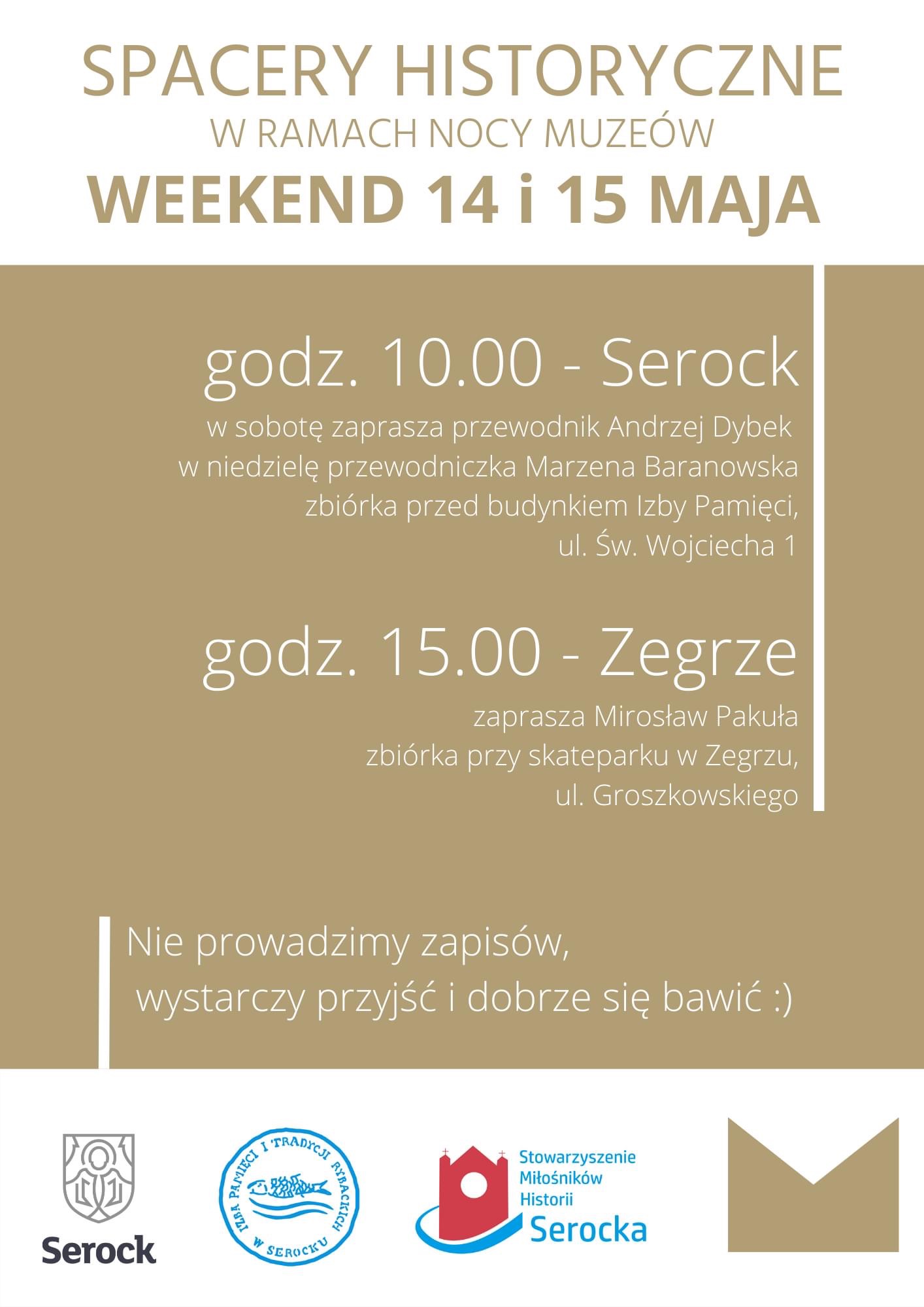W ramach tegorocznej akcji Noc Muzeów zapraszamy Państwa na weekendowe spacery - po Serocku i po Zegrzu. Wiemy, że taką formę spędzania tej akcji bardzo lubicie, dlatego proponujemy aż dwa dni na wędówki po gminie z historią w tle:
