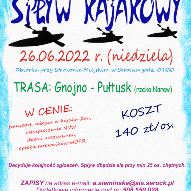 Serockie Inwestycje Samorządowe Sp. z o. o. zapraszają na spływ kajakowy. Szczegóły na plakacie.