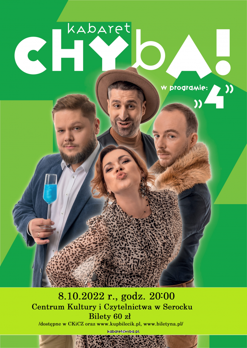 8 października o godz. 20:00 zapraszamy Państwa do Centrum Kultury i Czytelnictwa w Serocku na występ kabaretowy grupy Chyba! w programie: "4".