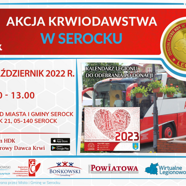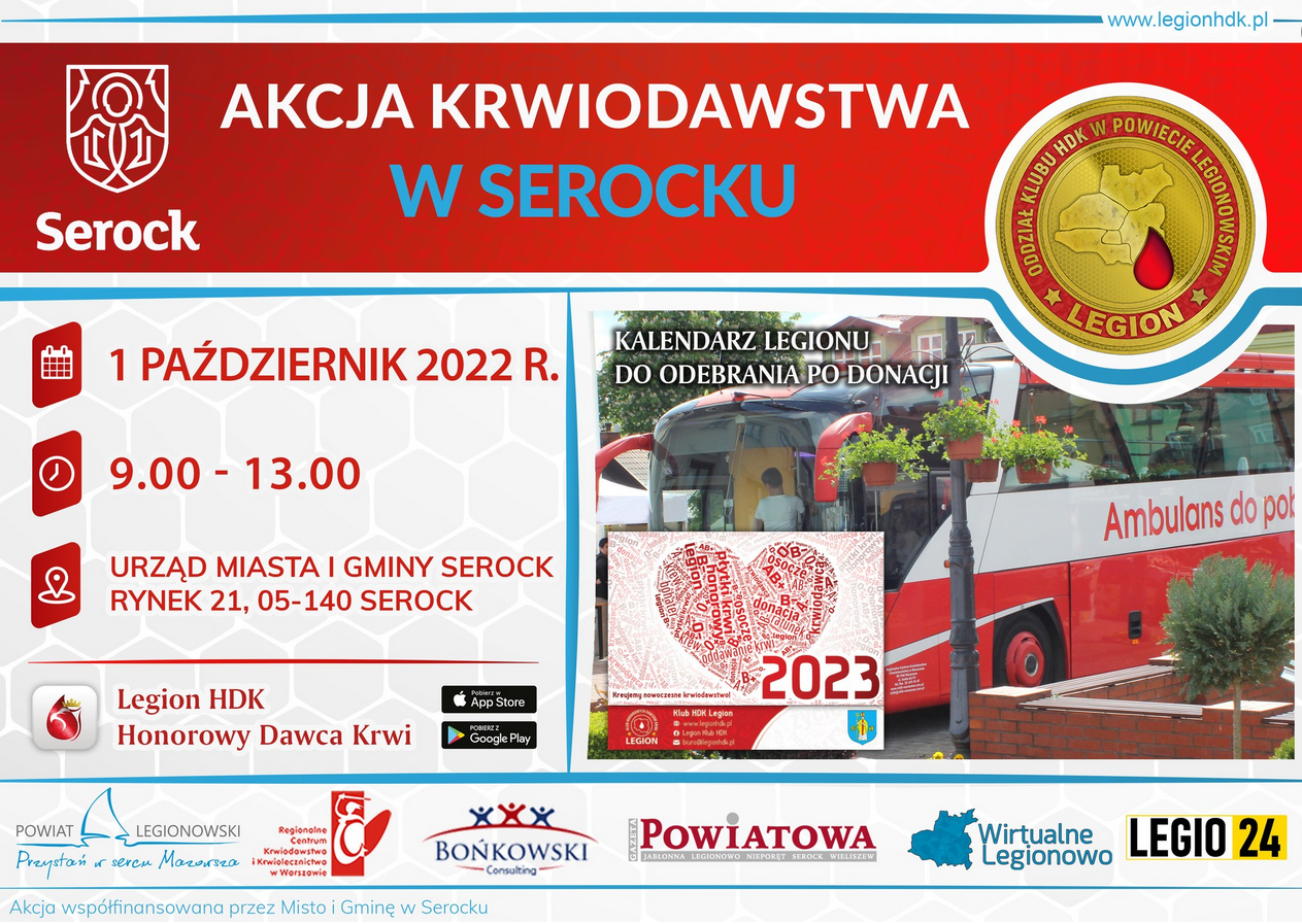 Zapraszamy na akcję krwiodawstwa. która odbędzie się w sobotę 1 października w godz. 9:00 - 13:00 przy Urzędzie Miasta i Gminy w Serocku. Po donacji możliwość odbioru kalendarza Legionu.