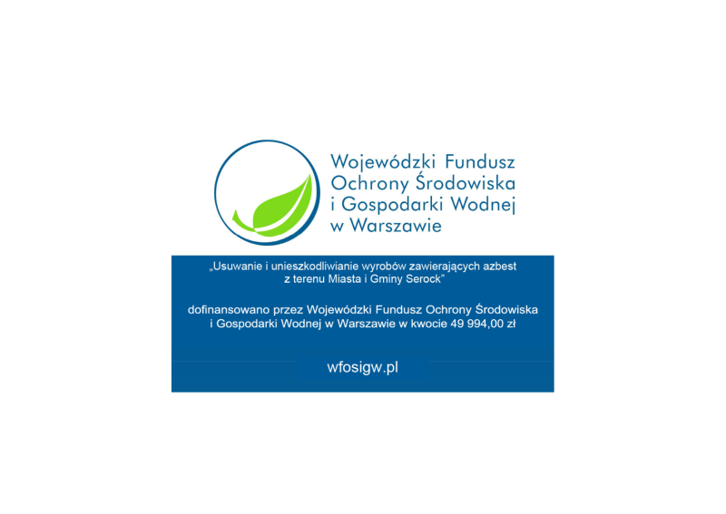Zadanie pn. „Usuwanie i unieszkodliwianie wyrobów zawierających azbest z terenu Miasta i Gminy Serock w 2025 roku” dofinansowano przez Wojewódzki Fundusz Ochrony Środowiska i Gospodarki Wodnej w Warszawie w formie dotacji w kwocie 49 994,00 zł w 2025 roku. Dofinansowania udzielono w ramach programu „2025-OZ-1 Usuwanie i unieszkodliwianie wyrobów zawierających azbest z terenu województwa mazowieckiego”.